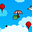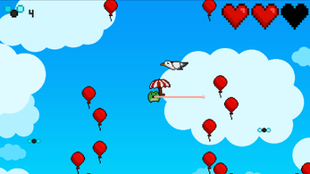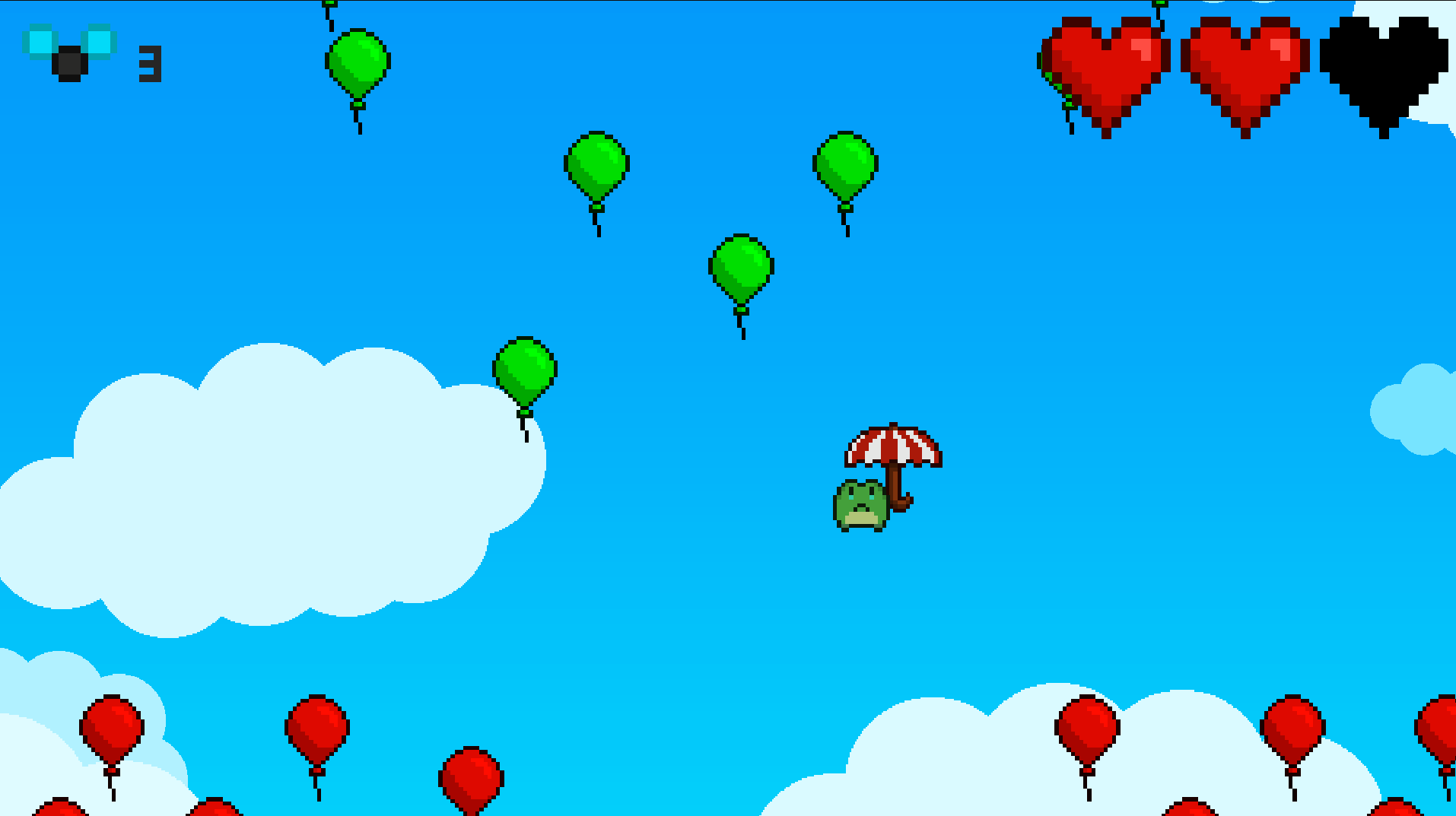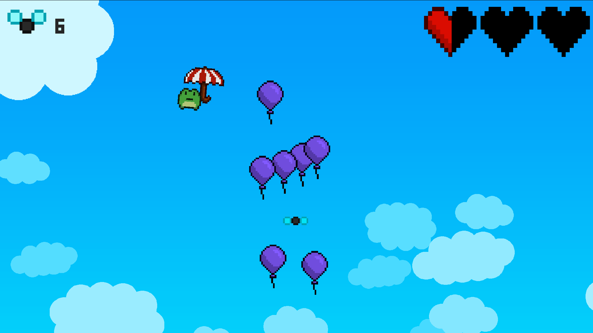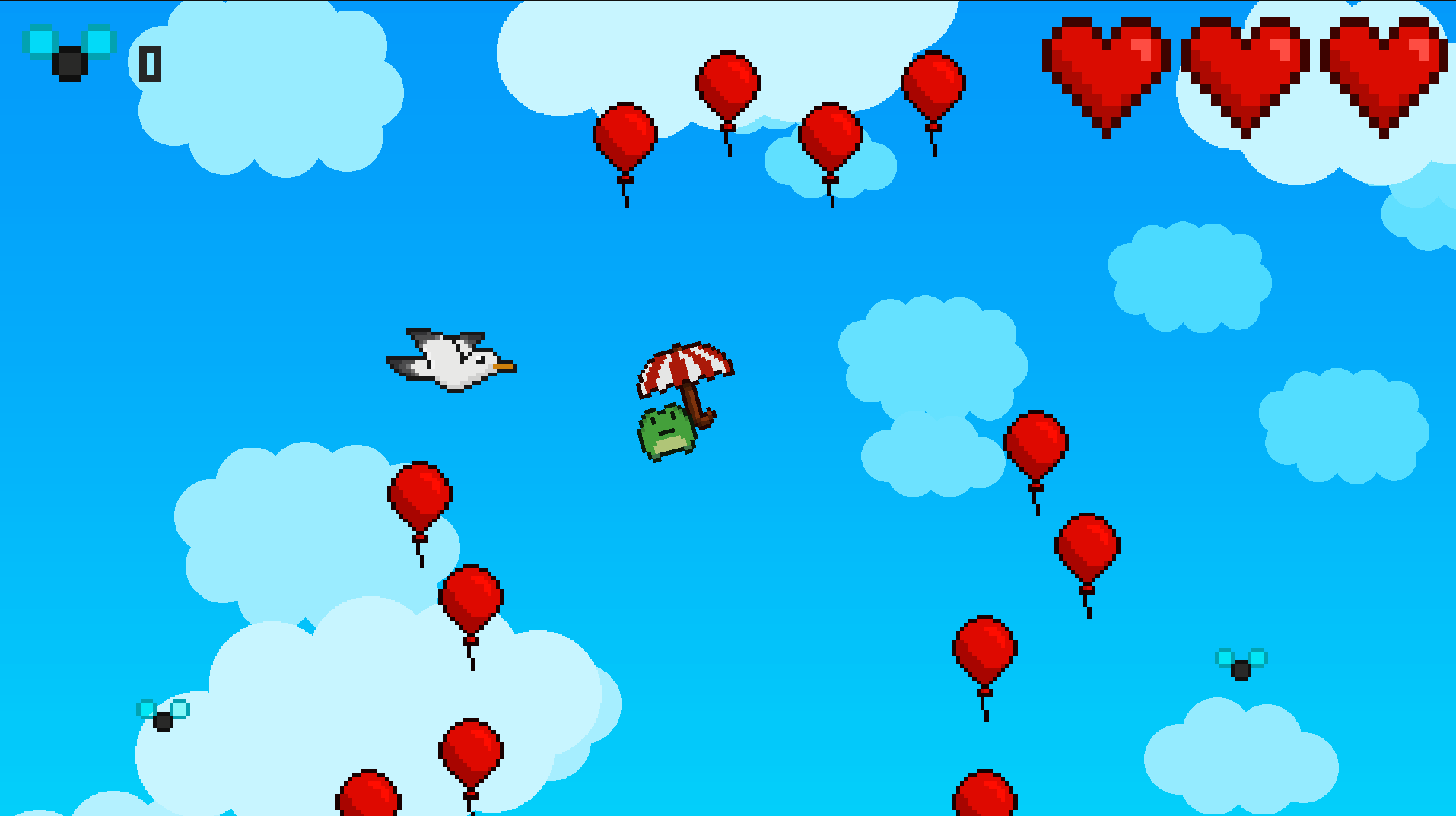 The frog falls from the sky, dodging balloons and birds and catching flies.